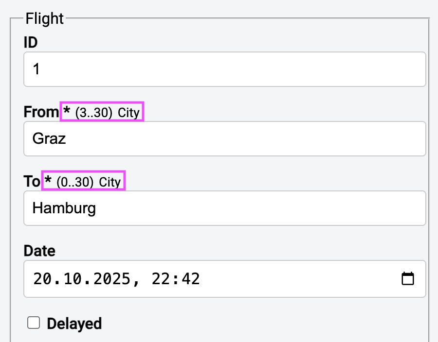 In addition, validate sets up a custom rule that checks from against three defined airports. In case of an error, this validator returns a ValidationError, which identifies the detected validation error with a string kind. The validator can also further describe the error using additional properties that it can freely specify. If a validator detects multiple errors, it can also return an array of ValidationErrors. If the validator cannot detect any errors, it returns the value null – true to the motto: no complaints are praise enough.