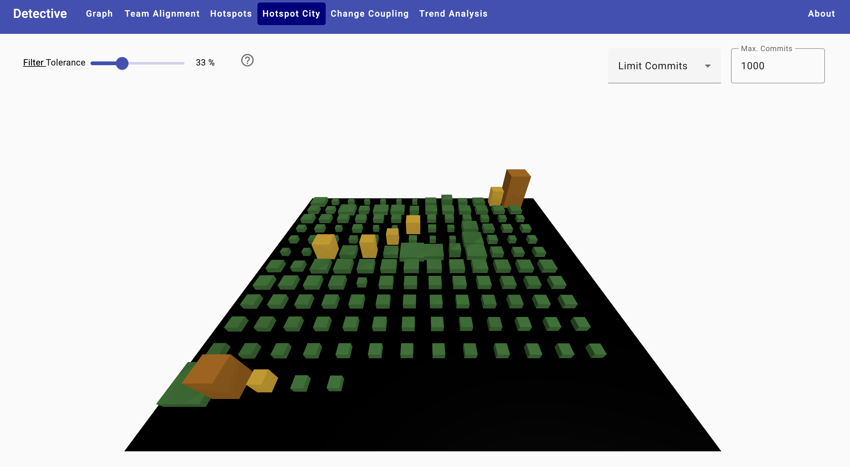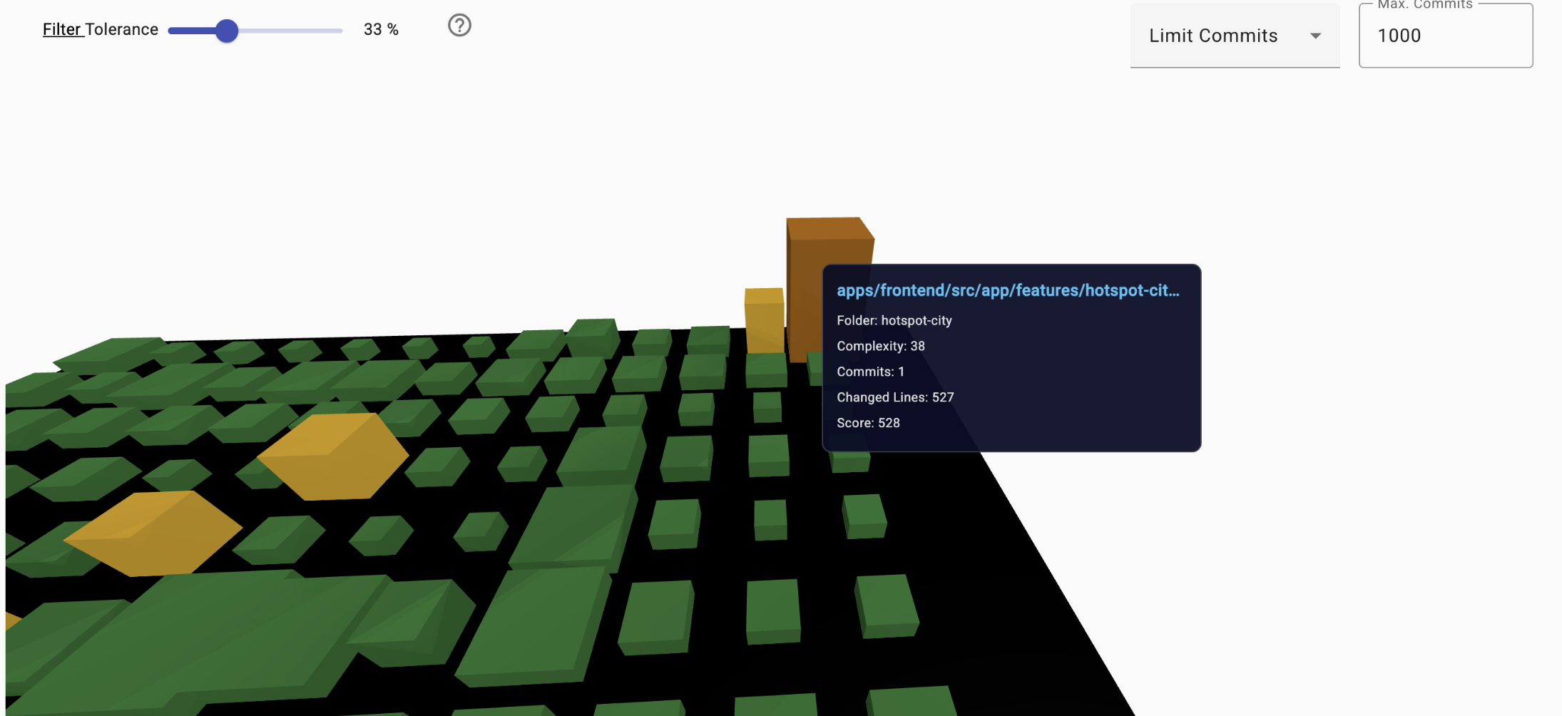 Let’s start with the new tool: Hotspot City. The idea is to render a 3D city based on your code and use footprint/height to visualize LOC and complexity, and color to visualize the score. Here’s a screenshot—but I recommend trying it so you can explore the scene in 3D.