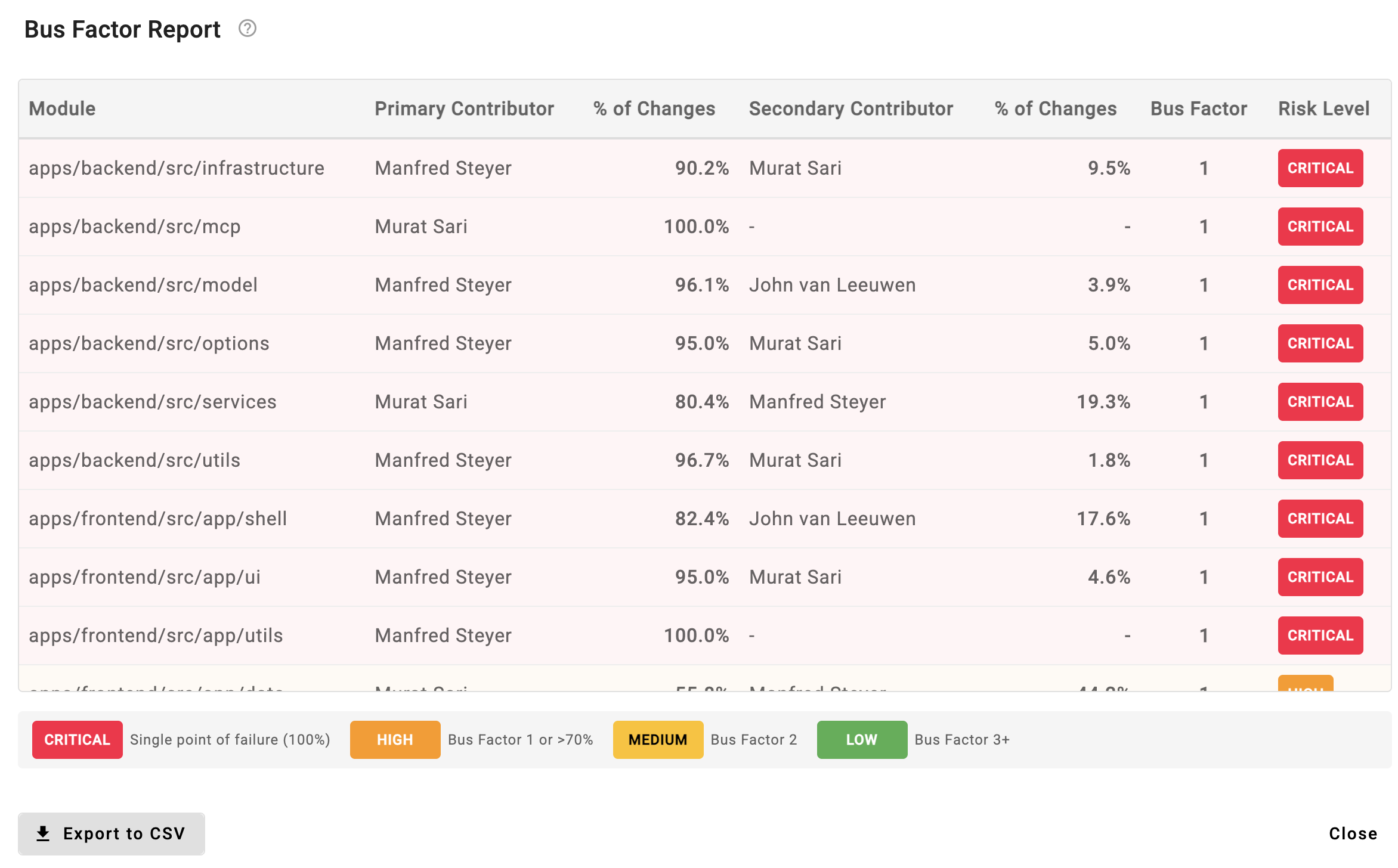Based on the selected modules, we now display a table with the primary and secondary contributors. This helps identify areas that need better knowledge sharing and team rotation.