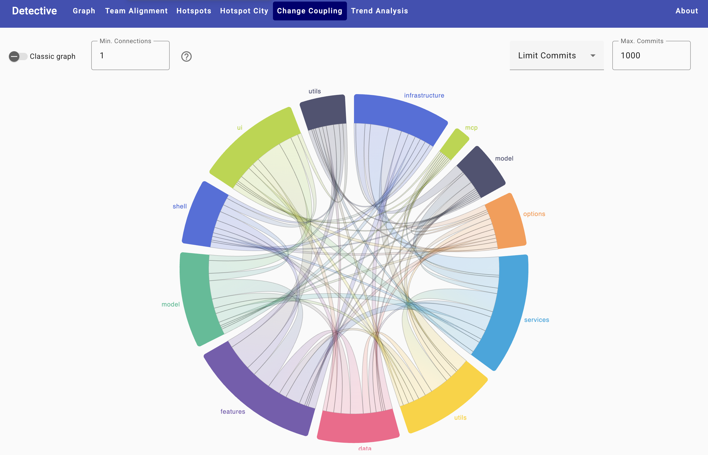 Detective’s new capabilities—Hotspot City, X‑Ray metrics, Bus Factor insights, Change Coupling’s chord diagram, and Trend Analysis—turn raw repository history and code structure into actionable signals. They help you spot where complexity is growing, where responsibilities leak across boundaries, and where knowledge is concentrated in too few hands. The goal is not to replace judgment but to focus attention where it matters most.