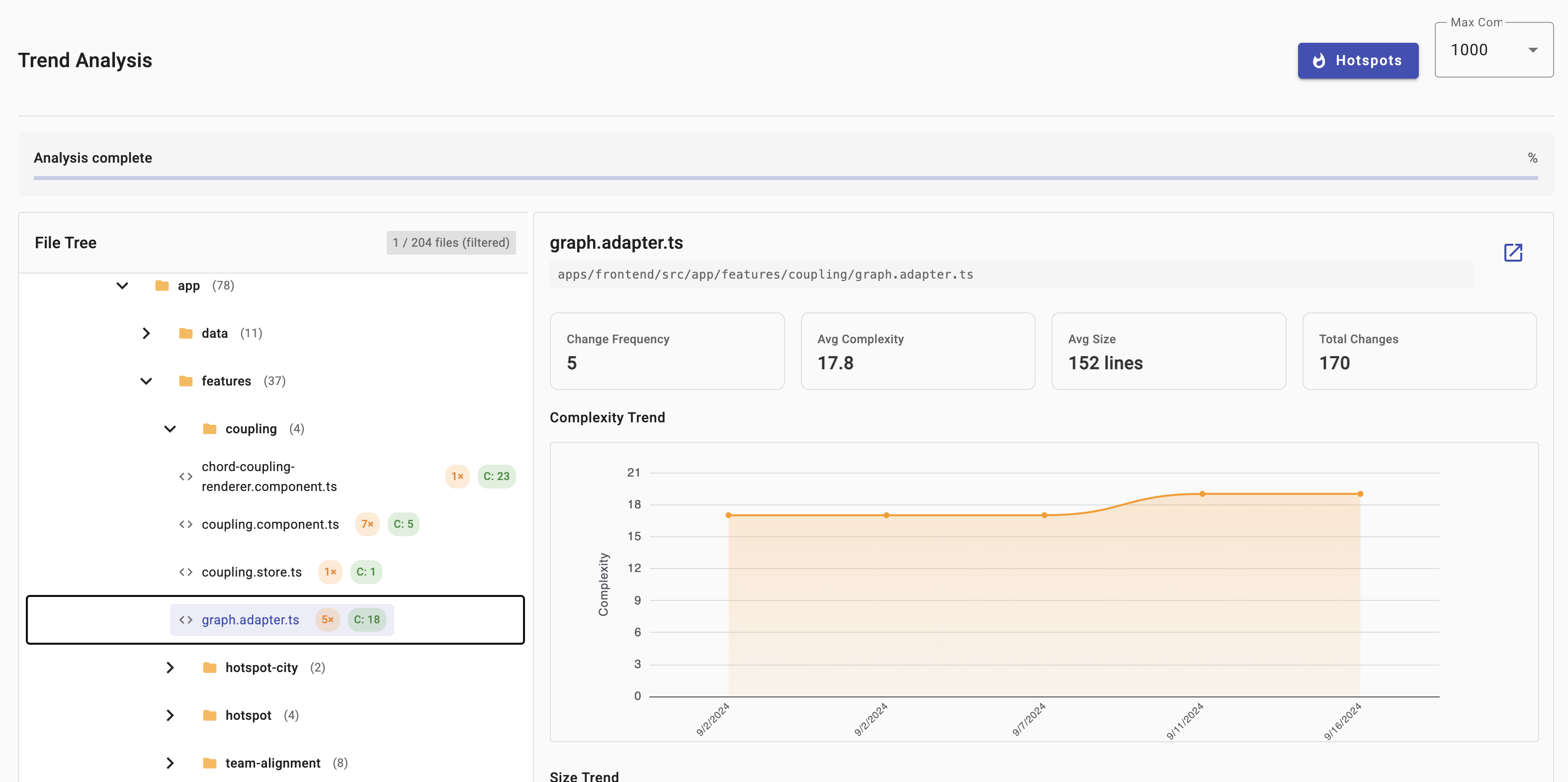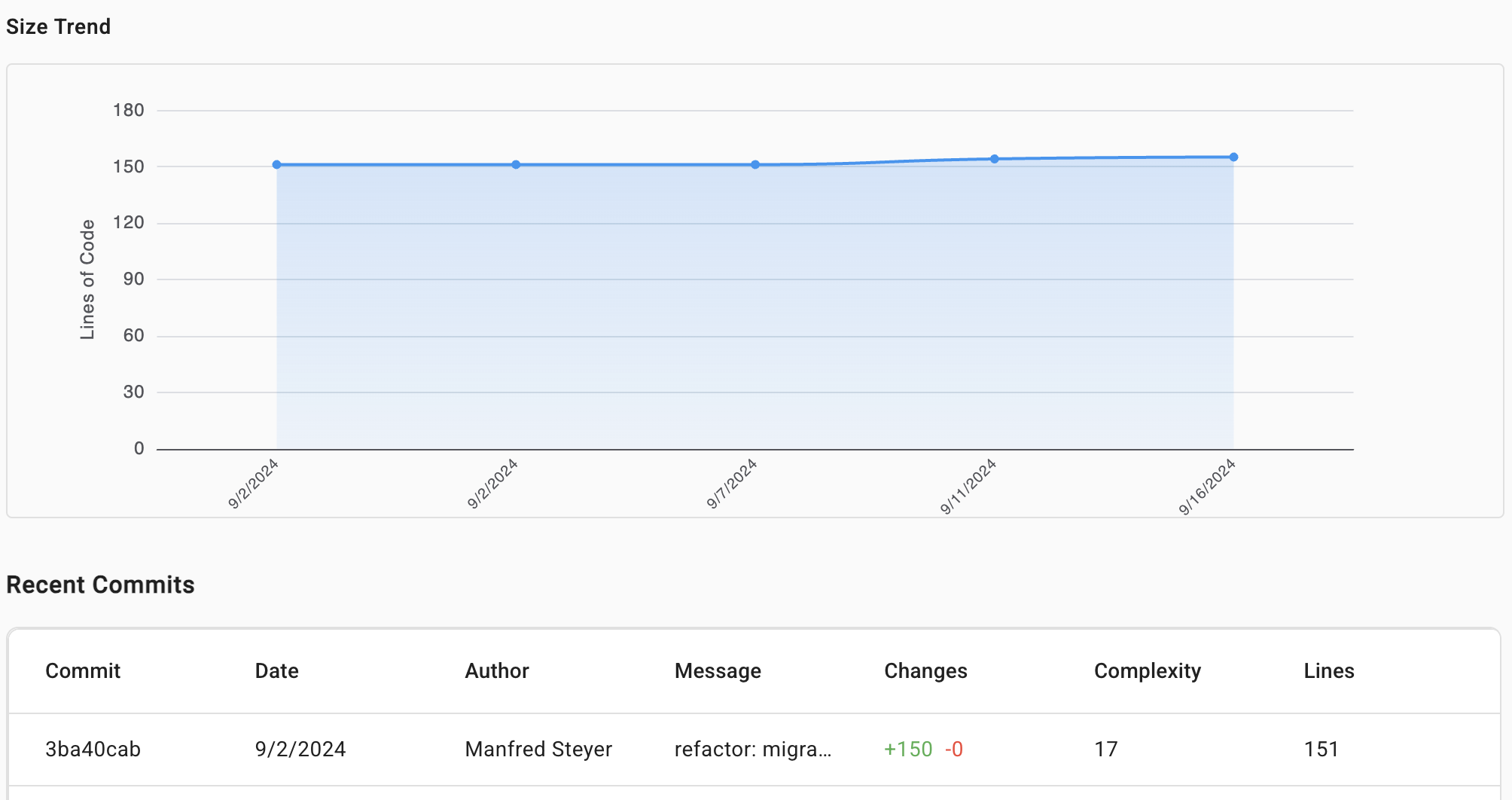 Last but not least, we added a brand‑new feature: Trend Analysis. Here, we iterate through each commit and each file and build trends for “Complexity” and “Size,” as shown below.