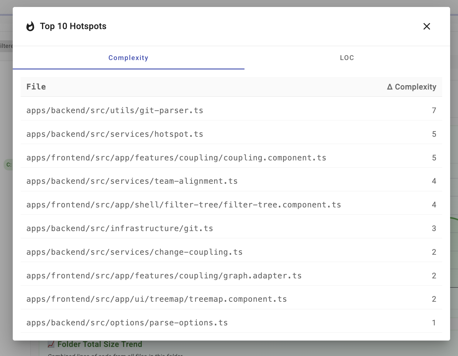 You can also open the X-Ray analysis for the files in view to investigate further. Often it’s enough to look at the top ten files with the biggest changes in complexity or LOC and jump straight into their X-Rays.
